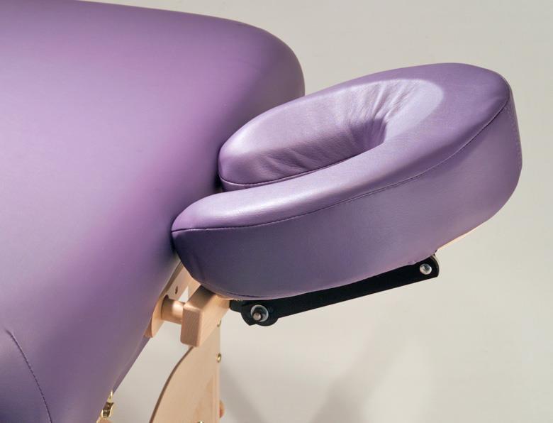 Our popular American made face rest has been a favorite for over a decade and features a slightly wider range of motion than our standard Dual Action. Fabric covered foam crescent-shaped pillow on a wooden base. A pair of 1.91 cm dowels insert into 9" on center outlet holes to attach face rest at either end of your Custom Craftworks table adding about 9" to the total length. Supports head in face down (prone) position. Allows cervical flexion. Rises and pivots vertically up and down for optimal comfort and placement of client’s head. Elevates 2" above the plane of the table, Full range of adjustment is 4"- 6". Pillow is attached with velcro strips on face rest base.