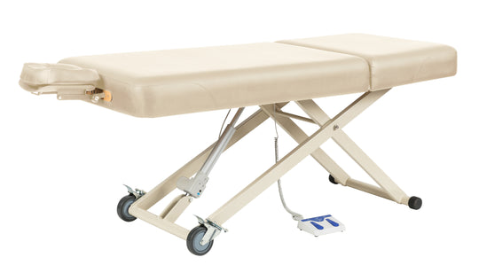 The Sierra Comfort Standard 2-Section Electric Lift Massage Table (SC-3001) is our favorite electric lift stationary massage table. The steel frame and 3” of high density foam offer durability and comfort.The table height is controlled electrically with a foot pedal assist, ranging from 16" to 31".